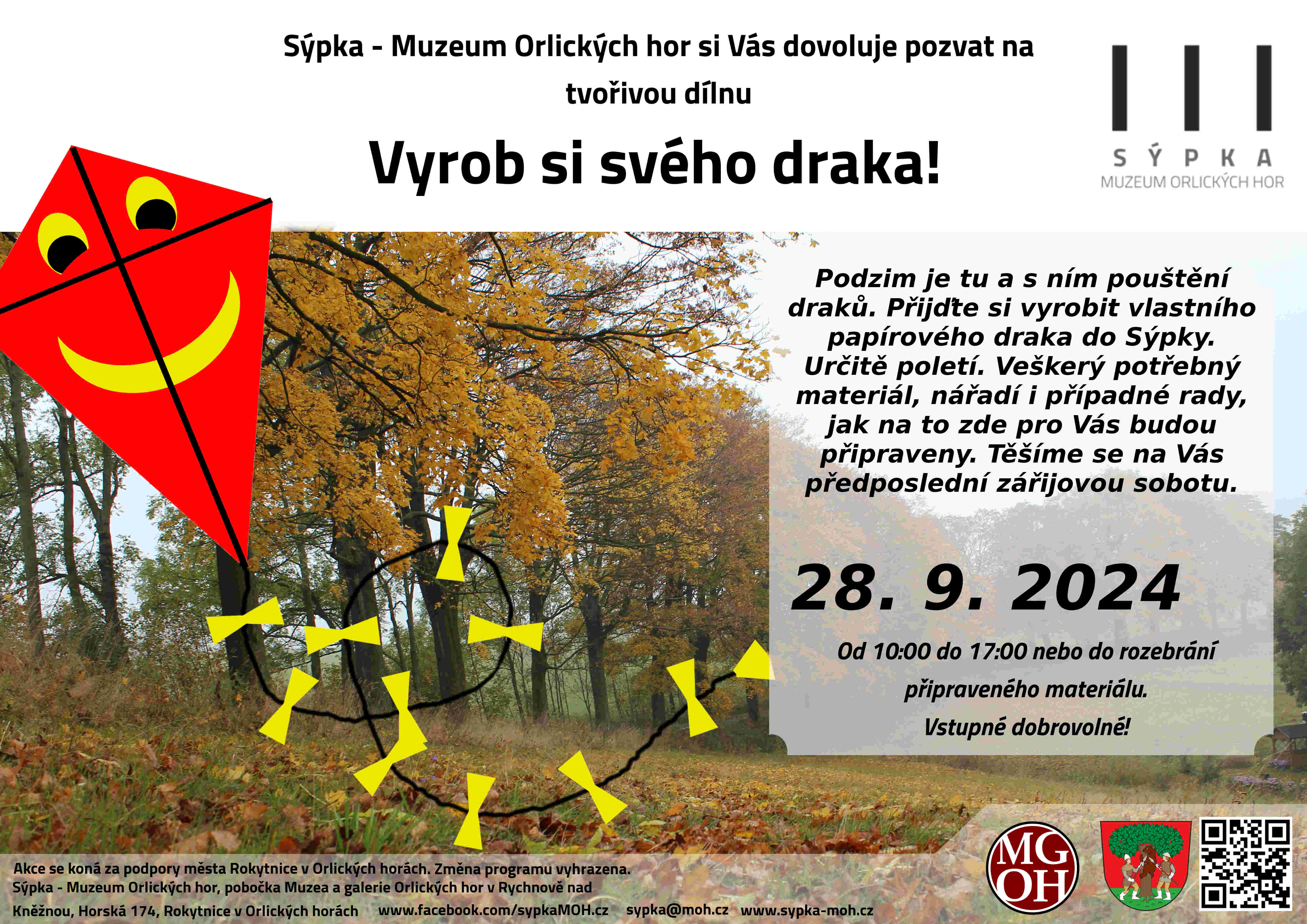 Podzim je tradičním časem pouštění draků. V minulosti si děti draky běžně vyráběly samy. Navažte v Sýpce na tuto tradici a vyrobte si svého vlastního papírového draka, který bude určitě létat!